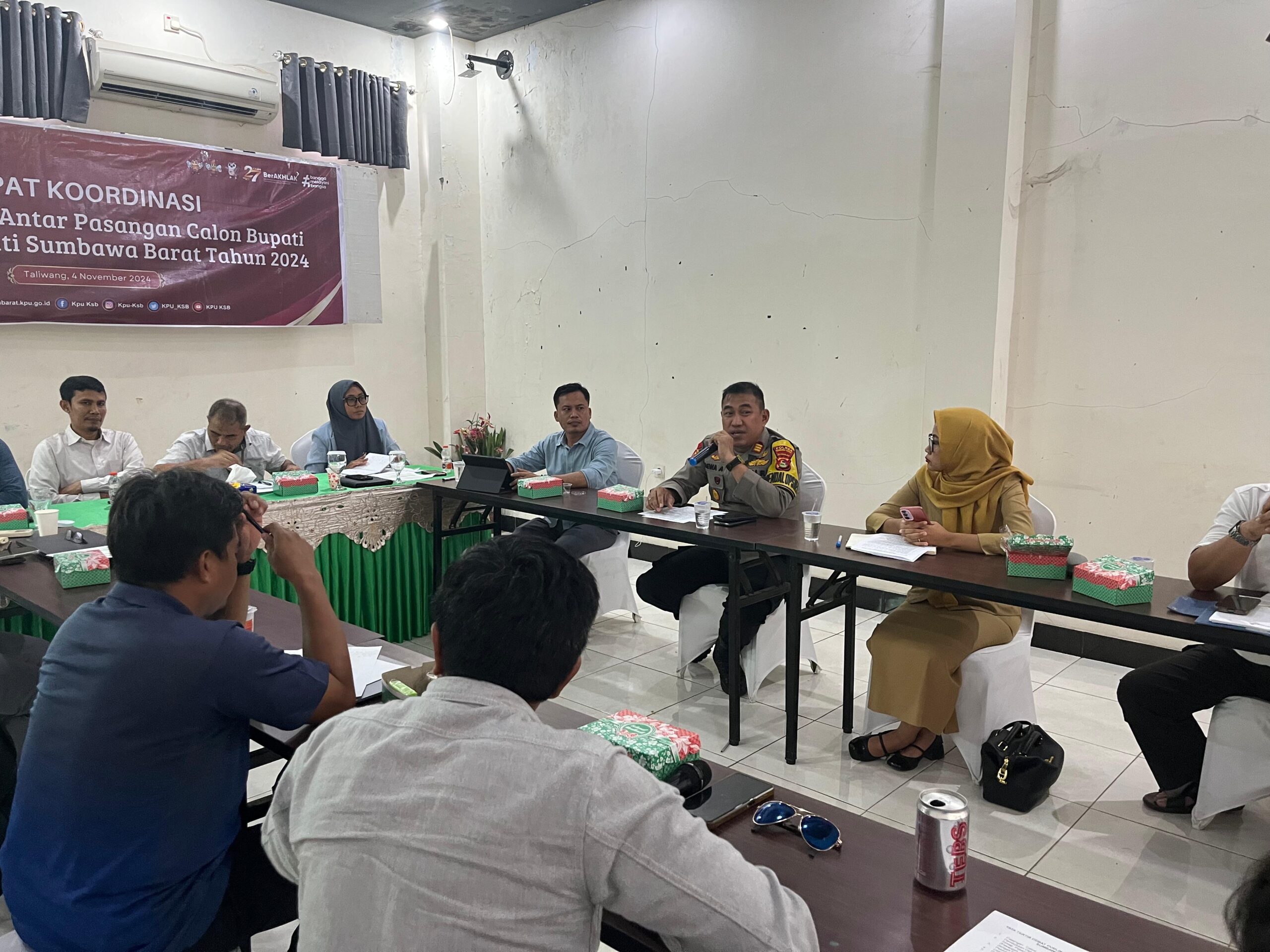 Kapolres Sumbawa Barat, AKBP Yasmara Harahap, S.I.K., melalui Kasi Humas, Iptu Zainal Abidin, S.H., menerangkan rapat koordinasi jelang pelaksanaan debat Pilkada tersebut dilaksanakan di Ruang Rapat KPU Sumbawa Barat yang dihadiri oleh Ketua KPU Sumbawa Barat, Herman Jayadi, S.A.P., Sekretaris KPU, L. Amrullah, Divisi Perencanaan, Data, dan Informasi, Doni Mas Ade, S.P., Ketua Bawaslu KSB, Khaeruddin, S.T., Kabag Ops Polres Sumbawa Barat, AKP I Dewa Gede Wija Astawa, S.H., Pasi Intel Kodim 1628/SB, Lettu Zulkifli, dan Kabid Kesbangpol, Titin Y. Pelaksanaan debat pertama rencana akan dilaksanakan tanggal 9 November 2024 di tempat yang akan ditentukan oleh KPU Sumbawa Barat.