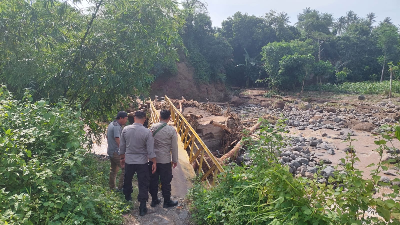 Iptu Dwi menyampaikan bahwa putusnya jembatan kali penghubung antar Dusun Dasan Tereng, Desa Gumantar dan dusun Sambik Jengkel, Desa Selengen tersebut akibat terbawa arus kali Kalisi yang pada saat itu sedang meluap.